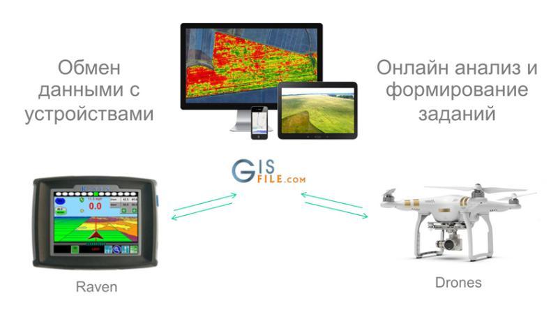 Online exchange data with the field equipment via the Raven Web service Slingshot has developed. This possibility allows to receive and analyze data from field equipment to GISFile service. The system allows to display the movement of equipment, calculate the actual processing area, the amount of seed material, fertilizers and the harvested crop. Also users can to overlay the spatial data with maps of previous years, agrochemical and NDVI maps.