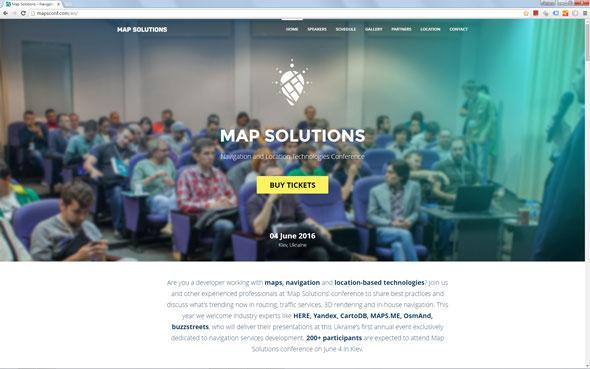 We participated at conference «Map Solutions» in Kiev 4h july 2016. Our team presented "Techniques of accelerate download and view interactive maps with an array of vector data of 100 thousand objects, and more." Also have presented their development and specialists Yandex, CartoDB, MAPS.ME, Osm and buzzstreets. In the course of the event we were able to share best practices and discuss innovations in the field of navigation services and technologies.